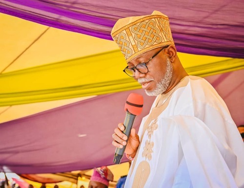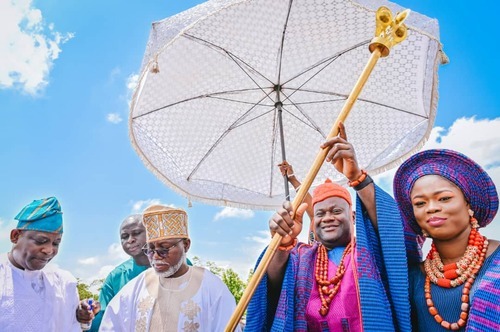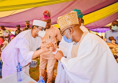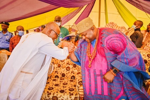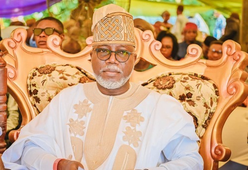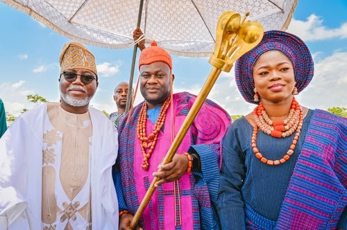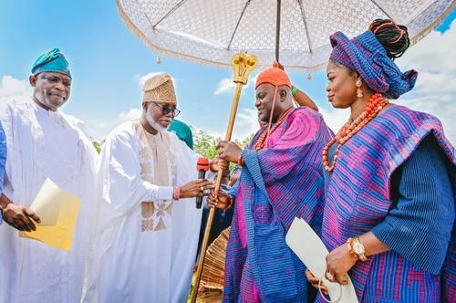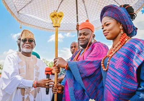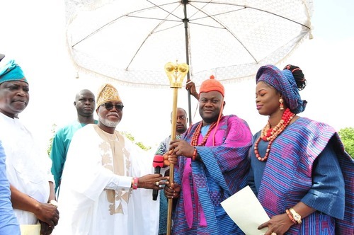 Ondo State Deputy Governor, Hon Lucky Aiyedatiwa (2nd L), presenting Staff of Office to the new Owa-Ale of Ikare-Akoko, Oba Adeleke Adefemi Adegbite-Adedoyin, while his wife, Olori Bukola and Permanent Secretary, Ministry of Local Government and Chieftaincy Affairs, Mr Segun Odusanya, looks on, during Oba Adegbite-Adedoyin's coronation ceremony and presentation of Staff of Office, held at Ansar-Ud-Deen Grammar School, Ikare today,