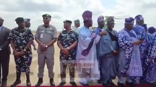 Obasanjo in Tinubu's uniform, as he welcomes President Bola Ahmed Tinubu in Ipẹru, Ogun State to commission laudable projects